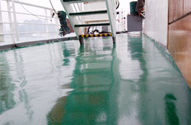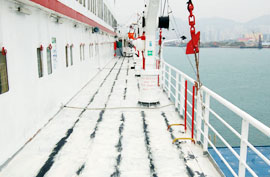 接到該訂單后,公司派一支素質(zhì)過硬的施工隊伍奔赴香港開始作業(yè),由于期間香港天氣變化反復(fù),時常下雨;待基面底漆頑固,銹跡斑斑難以清理,均為凹凸不平的麻面;再加上該郵輪白天需正常營業(yè),施工多只能在晚上進行,等等一系列因素都給施工帶來了嚴峻考驗。青龍公司歷來重視每一筆訂,注重每一個細節(jié),董事長宋敦清先生得知后,親自前往,與公司總工徐新生論證了一個最佳方案后開始指導(dǎo)施工,考慮到施工部位特殊,長期在海面上風吹日曬,最后選用了其耐候、耐酸堿、耐紫外線、耐老化、耐霉菌、耐鹽霧、耐臭氧、耐溶劑、耐磨、耐沖擊和耐油性等綜合性能優(yōu)異的CQ101防水密封涂料。先用特殊纖維填充10mm高度,再在上面找平3mm厚,然后用青龍CQ101防水密封涂料自流平成膜。經(jīng)過一個星期的艱苦奮戰(zhàn),順利完成施工。