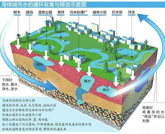 建海綿城市就要有“海綿體”。城市“海綿體”既包括河、湖、池塘等水系,也包括綠地、花園、可滲透路面這樣的城市配套設施。雨水通過這些“海綿體”下滲、滯蓄、凈化、回用,之后剩余部分徑流通過管網、泵站外排,從而可有效提高城市排水系統的標準,緩減城市內澇的壓力。