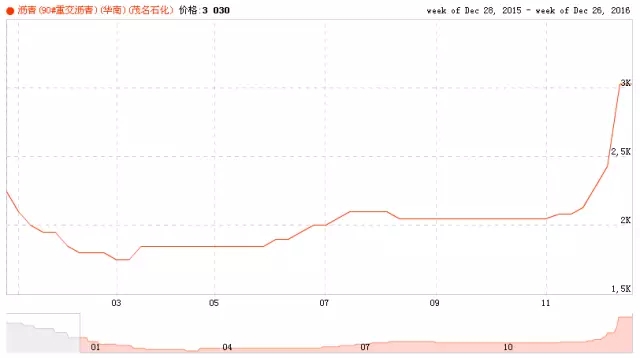 從茂名石化的90#重交瀝青價格數(shù)據(jù)看,11月初的價格還保持在2050元/噸,到12月19日,價格已經(jīng)上升至3030元/噸,漲幅達到47.80%。