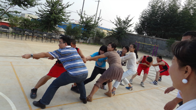 籃球賽后,雙方還進行了激烈刺激的拔河比賽,雙方成員派出4男4女進行拔河比賽,參賽隊員,啦啦隊、圍觀者人頭攢動,一派熱鬧的景象。隨著一聲哨響,兩邊隊員開始奮力向各自的方向拉,場外的啦啦隊們扯著嗓子吶喊助威,中間的紅色繩子開始搖擺,忽左忽右,僵持中,隊員臉上個個漲得通紅,經過一番激烈的拉扯,紅繩之后到了金鷹隊這邊,勝利的喜悅彌漫了整個工廠的上空,不管是輸家還是贏家,大伙都玩得不亦樂乎。