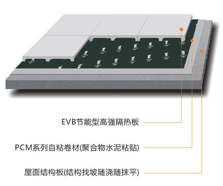 屋面防水保溫隔熱一體化系統的結構層次為結構層——青龍PCM系列自粘防水卷材——EVB節能型高強隔熱板(如下圖),大大減少傳統防水保溫屋面構造層次,減輕了屋面載荷,而且施工十分簡單,屋面防水維修非常方便,綜合性價比高,完全滿足屋面熱工指標計算要求,防水、隔熱效果顯著,防火等級為A級。