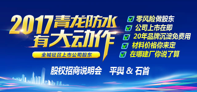 加盟青龍建材股份,20年防水品牌免費(fèi)給你用,投資50萬,做上市公司股東!合作辦廠,防水材料價(jià)格你說了算!心動(dòng)不如行動(dòng),選擇大于努力!