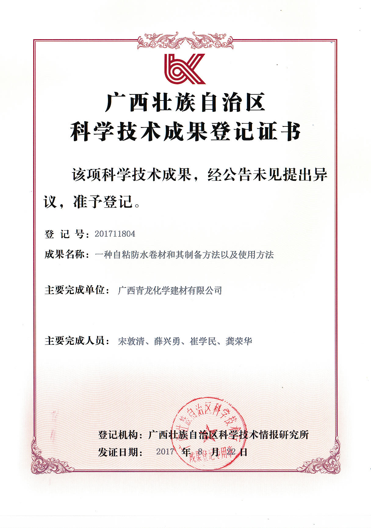 據公司博士團隊領頭人薛興勇介紹, 青龍公司自成立以來就高度重視科技創新投入,積極研發新技術、新工藝、新工法,培養了一批能夠站在行業技術前沿的科研骨干。同時充分重視產學研相結合,聯合多所高等學校及科研機構將科技轉化為生產力,為企業發展提供技術支撐。目前公司已擁有各類專利近50項,是享譽業界人的防水品牌。