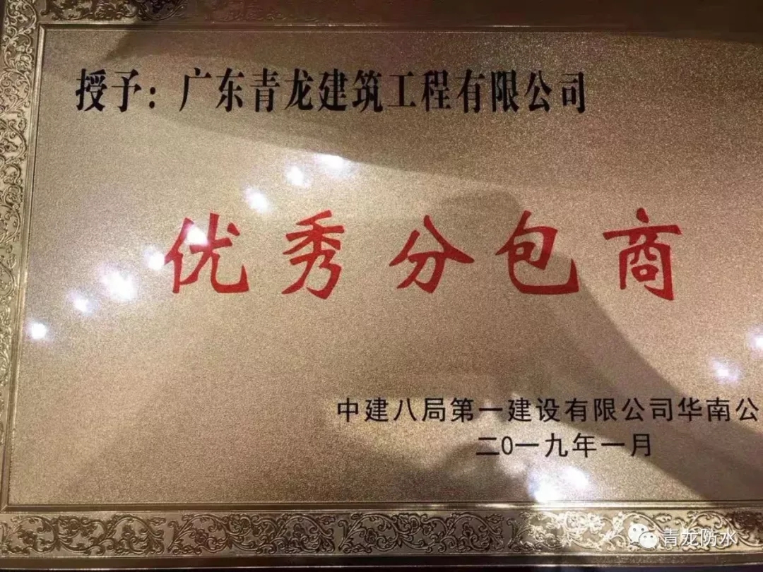 2019年1月,在中建八局第一建設有限公司華南公司2018年度優(yōu)秀分包商座談會上,我司喜獲"優(yōu)秀分包商"獎項,高度彰顯了青龍公司卓越的技術實力以及優(yōu)質的服務能力。