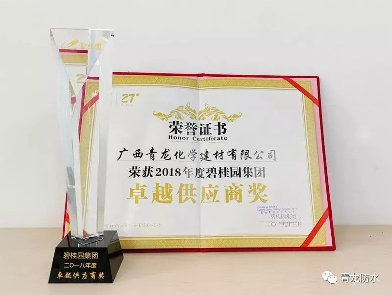 2019年3月7日下午,正值首屆"建筑防水工技能實操大賽"鏖戰(zhàn)正酣,在碧桂園集團2018年度供應商大會上,青龍公司憑借過硬的產品質量和良好的企業(yè)服務體系,喜獲2018年度"卓越供應商獎"稱號。