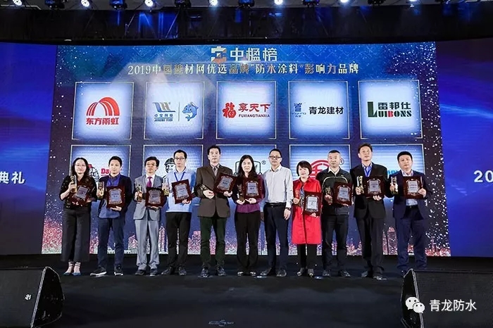 2019年5月9日,以"聚焦精裝,共筑未來"為主題的2019房地產供應鏈發(fā)展峰會暨"中楹磅"中國建材網(wǎng)優(yōu)選品牌頒獎典禮在廣州香格里拉酒店隆重舉行,青龍建材應邀出席,同時憑借品牌實力和市場影響力成功榮獲防水材料影響力品牌獎,這是對青龍公司長期以來的品牌經營和市場拓展的肯定與褒獎。