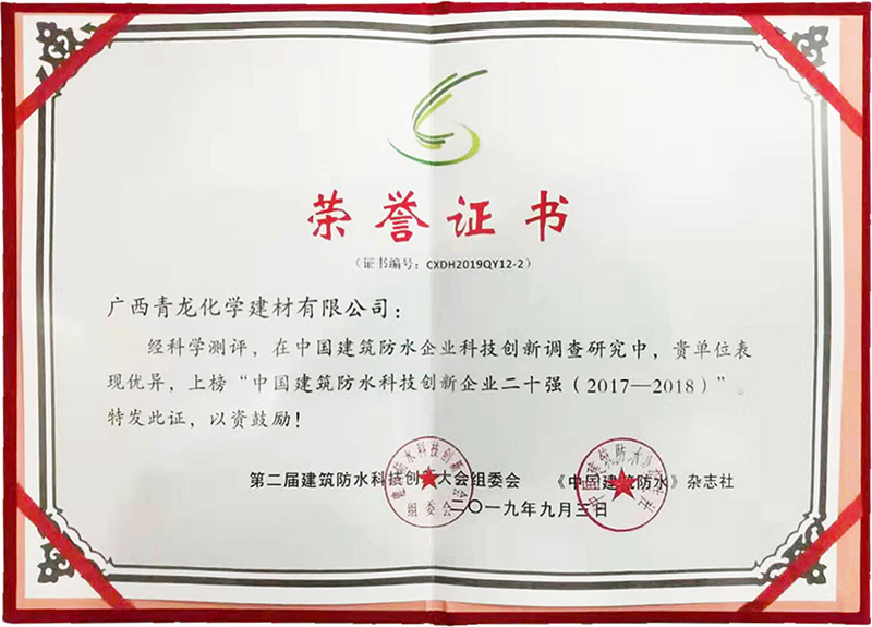 9月,第二屆建筑防水科技創新大會上,青龍司榮獲"中國建筑防水科技創新企業二十強",成為繼獲得首屆建筑防水科技創新大會"科技先鋒企業"和"科技先鋒人物"之后,青龍再獲"科技"類殊榮,彰顯了青龍公司強勁的科技創新實力和在行業的技術地位。
