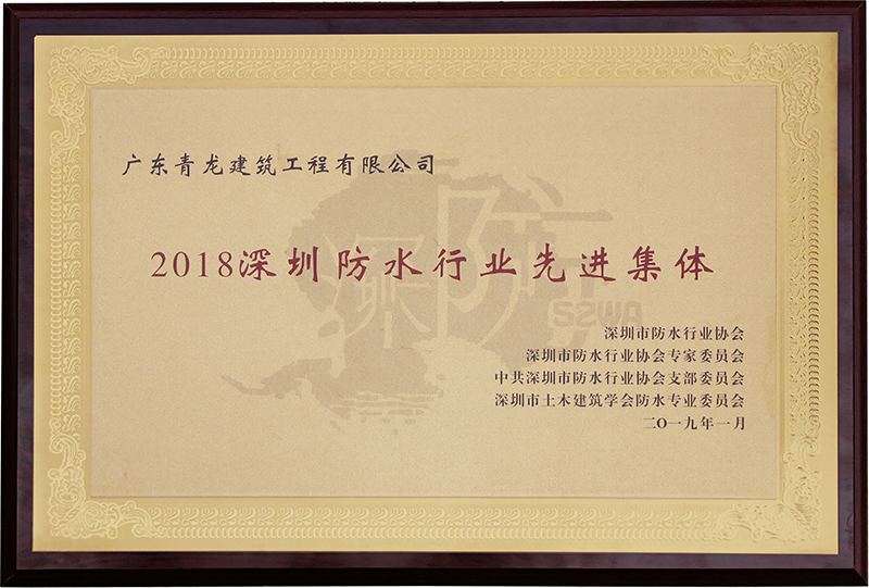 2019年1月9日,深圳防水協會2018年行業工作總結大會暨一屆三次會員代表大會上 ,青龍榮獲"2018年深圳防水行業先進集體獎",彰顯了行業對青龍防水團隊實力及為行業所做貢獻的肯定與認可。