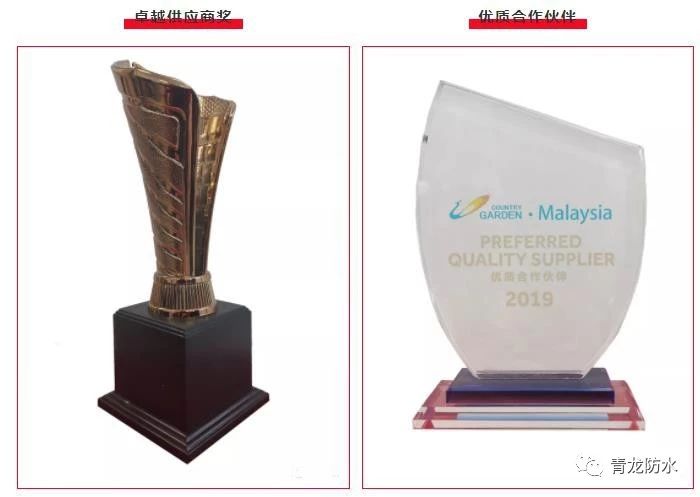 兩次榮獲碧桂園大獎,體現了青龍公司與碧桂園戰略合作的緊密,充分體現了碧桂園集團對青龍防水品質與服務的認可與肯定,完美展現了青龍公司22年的強大品牌實力。