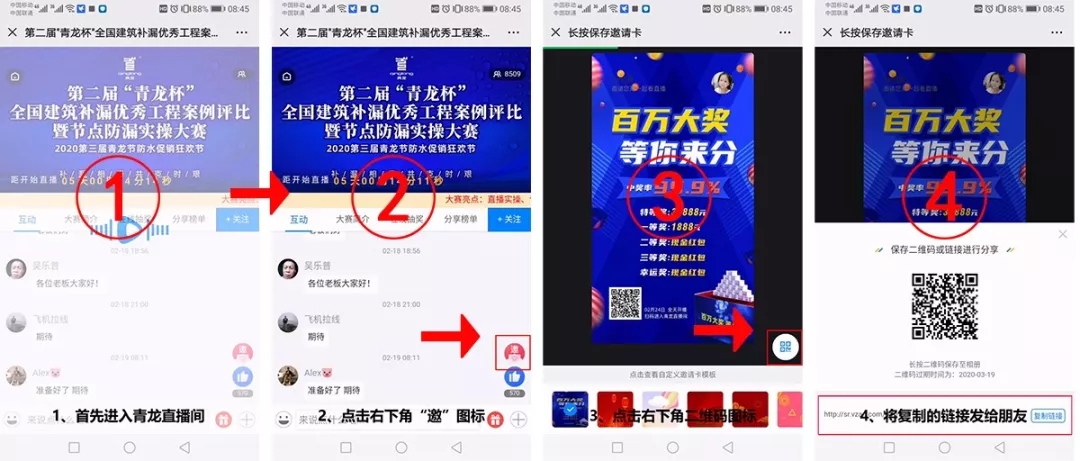 2、邀約朋友進直播間觀看有獎:凡邀約朋友進入青龍直播間觀看,直播榜單上的邀約人數(shù),即成為你的邀約榜單人數(shù),每邀約1人即可獲得1元獎勵。最終獎勵僅限前10名。同時為保證活動的公正性,凡后臺發(fā)現(xiàn)數(shù)據(jù)增加異常,系統(tǒng)將自動判定為惡意作弊,將取消其參加活動資格。(邀約方法:青龍直播間→右下角"邀"圖標→右下角二維碼圖標→將復(fù)制的鏈接發(fā)給微信朋友。朋友點擊后,即成為你的邀約下線。)