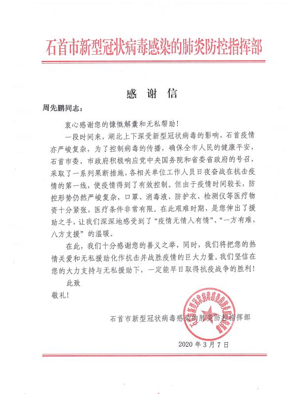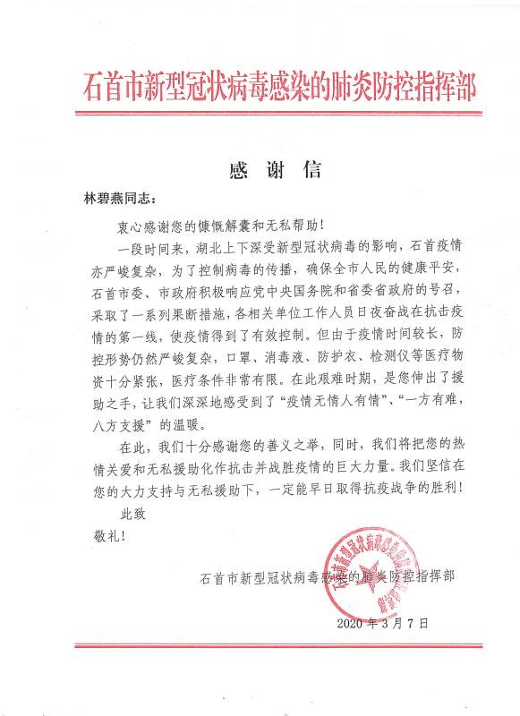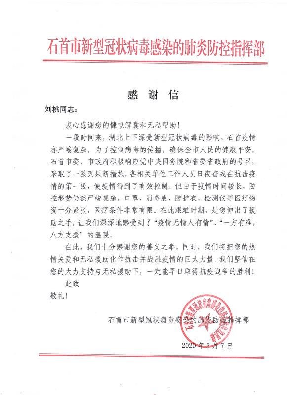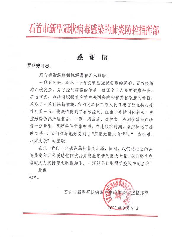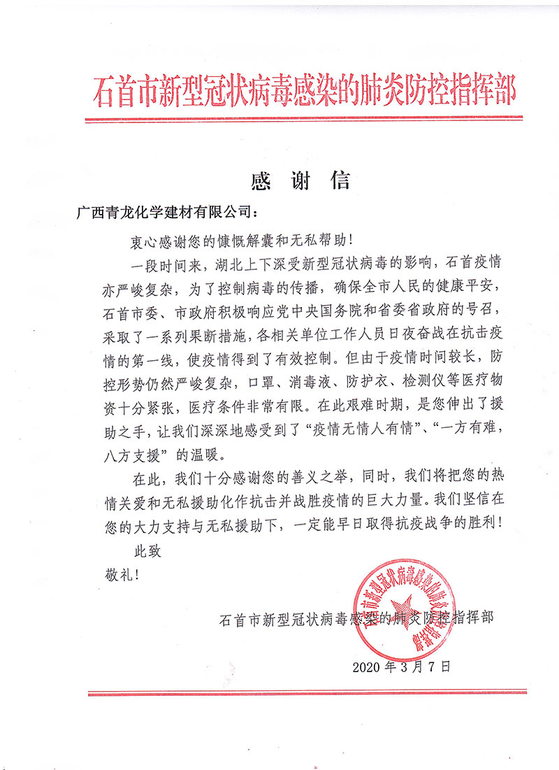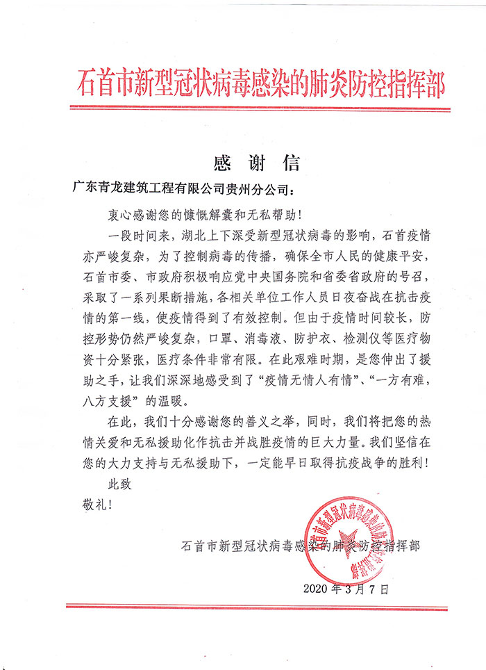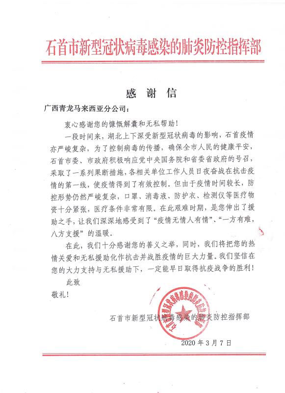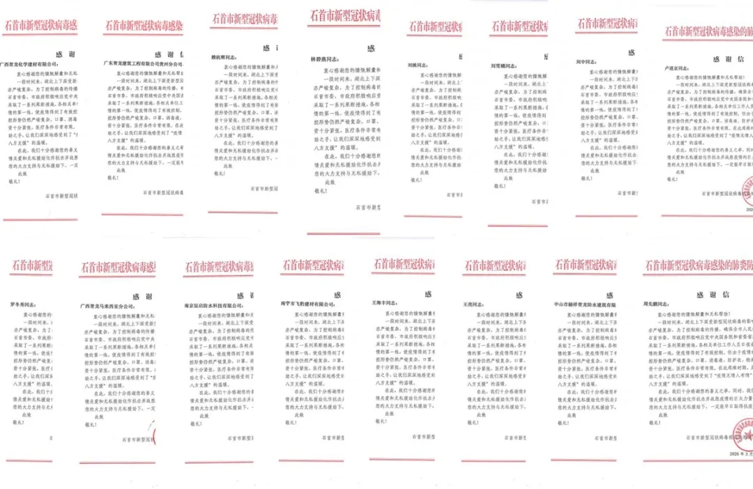 當全國疫情數據持續向好,各地復工復產有序進行的時候。青龍公司收到了來自湖北省石首市新型冠狀病毒感染的肺炎防控指揮部16封特殊的感謝信。