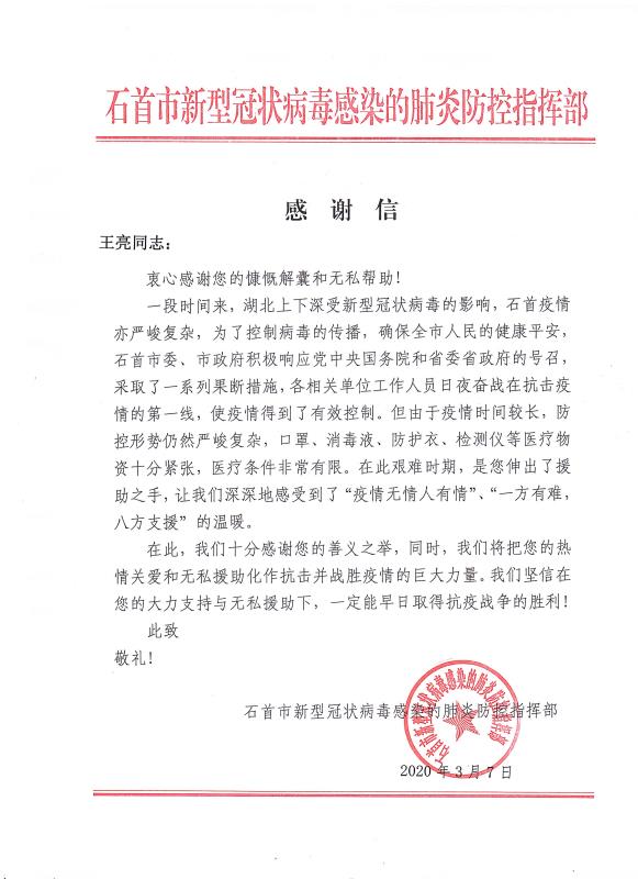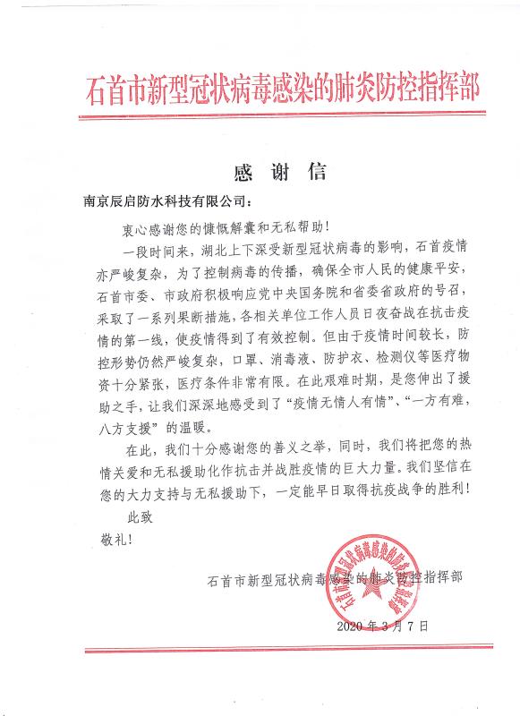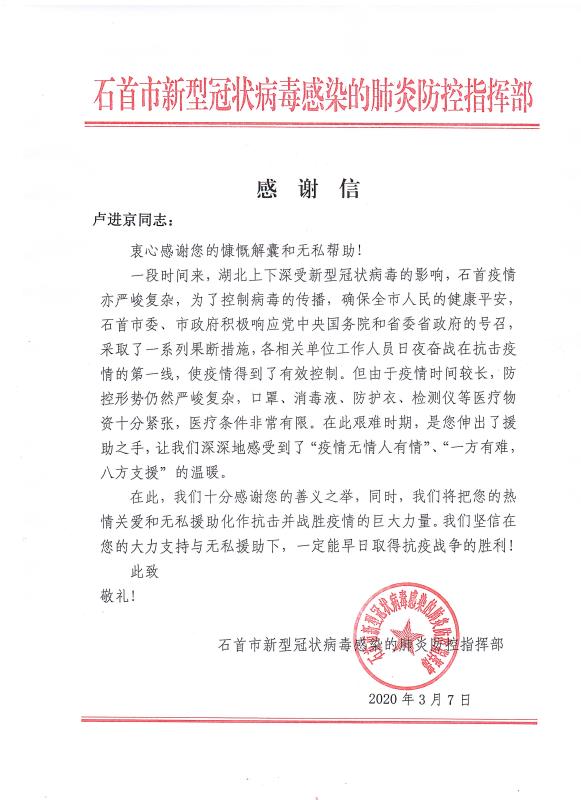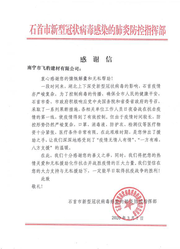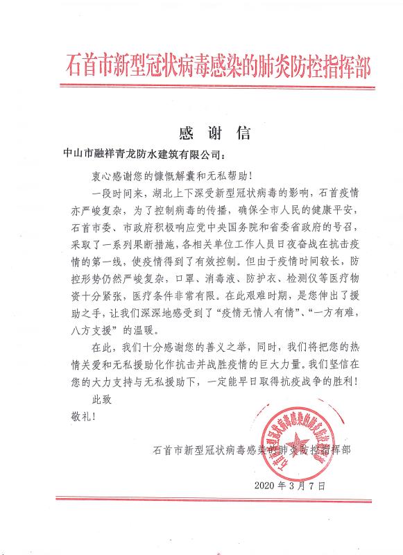 感謝信來自石首市新型冠狀病毒感染的肺炎防控指揮部,信中表示,對青龍公司及旗下代理商善義之舉表示了高度肯定和感謝,將把大家的"熱情關愛和無私援助化作抗擊并戰勝疫情的巨大力量,早日取得抗疫戰爭的勝利!"