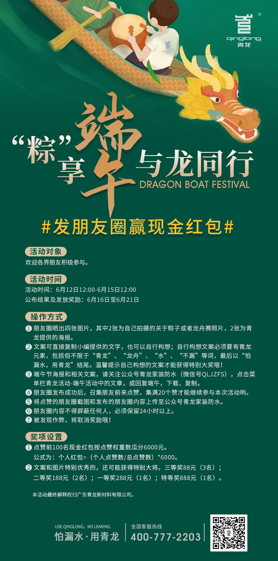 (2)文案可直接復制小編提供的文字,也可以自行構想;自行構想文案必須要有青龍元素,包括但不限于"青龍"、"龍舟"、"水"、"不漏"等詞,最后以"怕漏水,用青龍"結尾。(溫馨提示:自己撰寫的文案才能獲得特別大獎哦!)