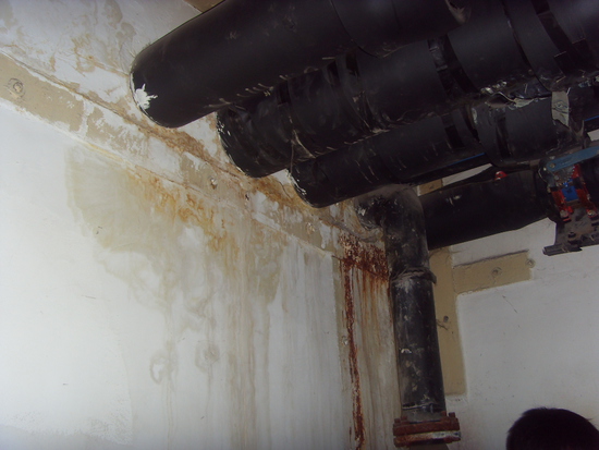 (4)穿墻管部位也是外防水薄弱的環節,如選用卷材處理管根,該部位卷材搭接邊較多,很難做到所有部位搭接滿粘,另外穿墻管周邊混凝土振搗密實程度不夠,在管根周邊外防水出現問題后,就會從接縫周邊向內滲漏。