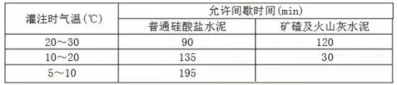 ⑺混凝土澆筑必須連續(xù),因施工需要留設(shè)施工縫,必須征得設(shè)計(jì)同意,并得到監(jiān)理認(rèn)可。允許間歇時(shí)間具體見下表;搗固選用的振搗器,其頻率、振幅、振動速度等參數(shù)視混凝土的塌落度及骨料顆徑而定。
