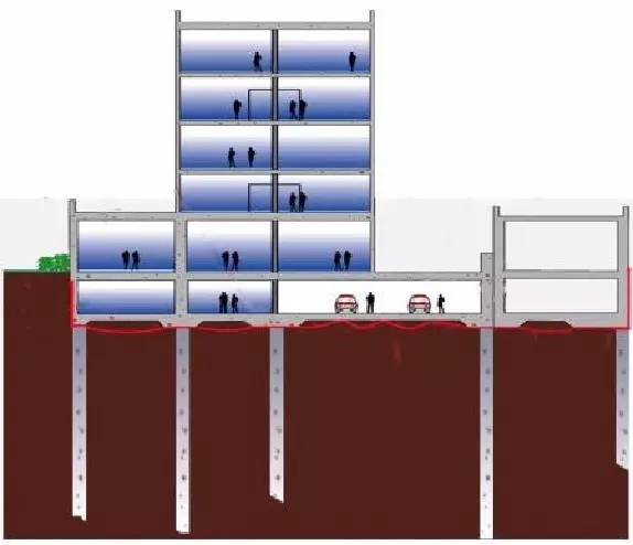 防水層僅向上反粘于細石砼保護層上,而細石砼保護層與后澆鋼 筋砼底板形成施工縫,造成防水層不能真正意義上與后澆鋼筋砼底板反粘。
