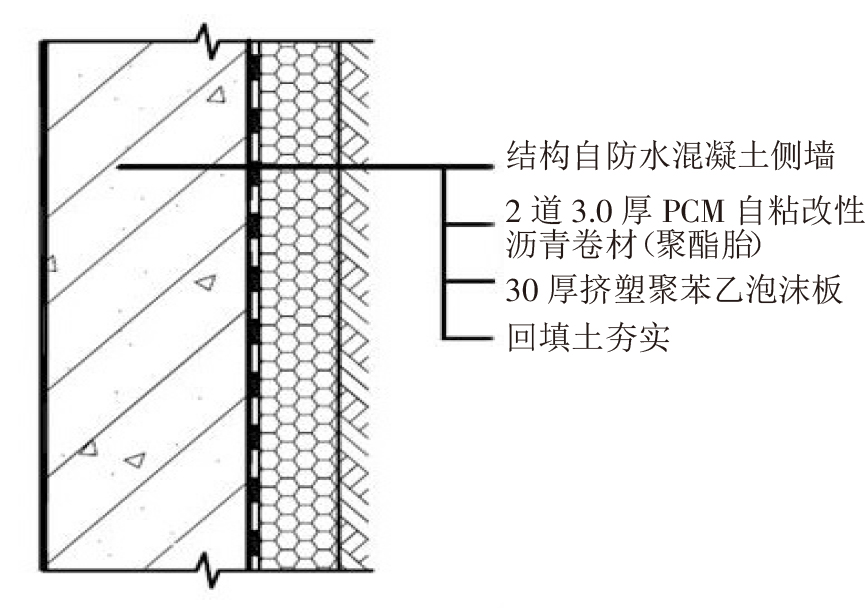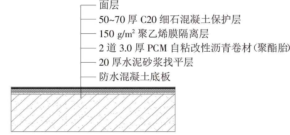 防水卷材選用本公司生產的3.0mm厚PCM自粘聚合物改性瀝青防水卷材(PY類)。該卷材是通過在樹脂和合成橡膠改性瀝青中加入少量活性成分,以聚酯胎作為胎體,以PE膜為表面材料,結合硅油隔離膜制備而成的防水卷材。該卷材具備較強的基層防竄水性能,卷材中的高分子材料可與基層粘接劑中的高分子和無機膠凝材料構成界面互穿網絡,能有效避免防水層出現整體失效的情況。材料可冷施工,無火災隱患,不會污染環境,可直接在潮濕的基面上進行施工,基層無需做找平層,施工工藝便捷。另外,防水材料有較好的穩定性、延伸性、耐腐蝕性和耐候性。