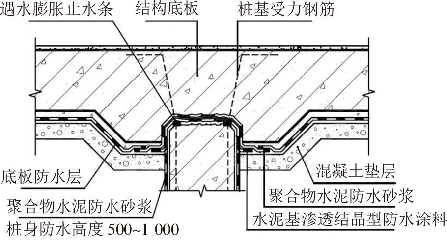 施工時,先對基層進行清理,保證基面無灰塵、浮砂、雜物和明水;陰陽角用水泥砂漿抹成圓弧,然后對樁頭采用滲透結晶型防水涂料進行涂刷,用量為1.5kg/m2左右,并將樁頭上的砂眼和細小縫隙用防水涂料密實。同時,在樁頭四周300mm左右范圍內涂刷聚合物水泥防水砂漿作為過渡層(圖9)。