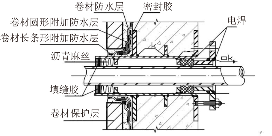 管道、線纜等存在更換需求,需用套管式防水設計,套管加焊止水環。套管與管道或線纜之間不得承受水壓,應在節點的外部設置集水井。室內套管的一端應與外墻平齊,澆筑混凝土時端口預留的套管需密封,防止堵塞孔洞。室外套管突出外墻至少150mm,在外墻模板上定好預留穿墻管位置并開洞,外墻合模之前把套管放入模板洞中固定好,合模后再密封穿墻管與模板之間的間隙。管道與套管之間的間隙用柔性材料填充,保證端面光滑,同時管道的接口不得設置在套管內。當地下水位較高時,需在套管周圍設緊固裝置來確保縫隙的填充料密實和不發生位移(圖7)