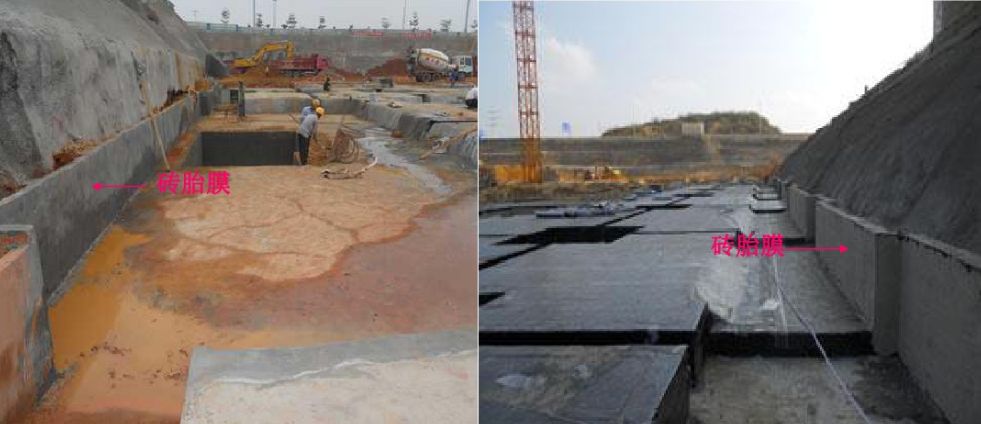 2、磚胎膜(亦稱臨時擋土墻):磚胎模一般用于地下室底板側壁,由于是外防水,須在墊層上做防水,且防水要延伸到磚胎膜上,以便以后澆注完混凝土后,防水能上翻到側壁混凝土上,如果底板側壁用模板的話,無法做防水,所以采用了用磚做模板的辦法。另外在一些澆完混凝土后模板無法拆除或者拆除難度很大的地方也有采用磚來代替一 般模板的辦法。