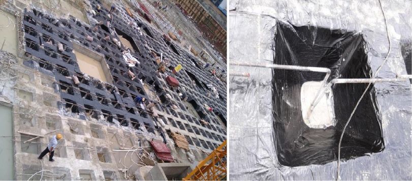 2、預鋪反粘 ——將附有高分子自粘膠膜層的防水卷材空鋪在基面上,然后澆筑結構混凝土,使混凝土漿料與卷材自粘膠膜層緊密結合的施工方法。