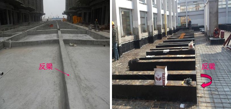 10、反梁:反梁只是一種需要,是因為某些原因(如層高不夠、梁底面需要平整,而梁上部又可上翻等),而把梁高的一部分作到樓板的上方(一般的梁都是與樓板平的)或者是筏板基礎上表面需要平整而把梁做到板的下面。