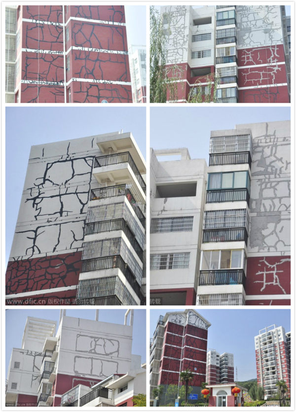 2014年10月10日,武漢市建成已經三年的江夏區武昌大道某小區,房屋外墻就出現不同程度的裂縫,于是有的樓棟側墻整面用黑色防水涂料涂成框框以防滲漏,從遠處觀看,似乎給墻體綁上了“繃帶”。但是這樣的外墻“綁繃帶”真的能堵住滲漏嗎?