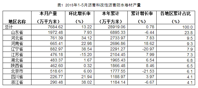為進一步了解我國瀝青和改性瀝青防水卷材產量,國家統計局對產量較大的176家防水企業進行統計,1-5月,瀝青和改性瀝青防水卷材產量為28919.06萬平方米,同比增長0.78%;其中山東地區產量較大,為6895.33萬平方米,同比下降6.44%,占全國累計產量的23.8%。