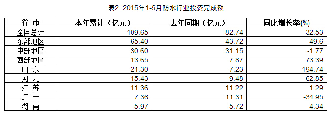 國家統計局對主營業務收入高于2000萬元企業進行統計,1-5月,防水行業投資完成額109.65億元,同比增長32.53%。其中,山東地區的投資完成額為21.30億元,同比增長194.74%。