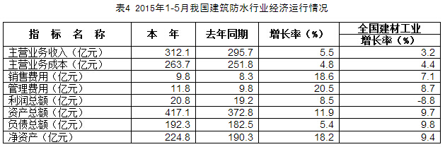 對全國491家主營業務收入在2000萬元以上的企業進行統計,資料顯示,1-5月,防水行業企業累計主營業務收入312.1億元,同比增長5.5%,增幅高于全國建材工業2.3個百分點。主營業務成本增幅略高于全國建材工業。利潤總額為20.8億元,同比增長8.5%,全國建材工業利潤總額負增長,同比下降8.8%。