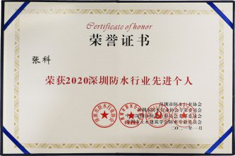 青龍防水張科榮獲深圳市防水行業協會“先進個人”稱號
